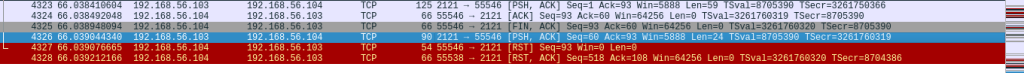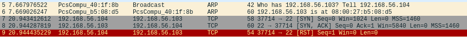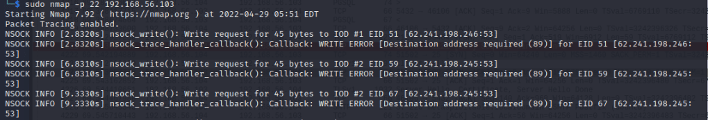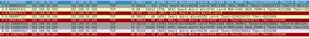 Running command “sudo -sT -p 22 192.168.56.103” generated the following traffic and output. To note here is that the program first initiated connections to both ports 80 and 443, probably as the host discovery method, reset their connections and then completed the TCP handshake with port 22. If the server accepted the connection request, the TCP handshake was comlpeted in every connection before termination as expected.