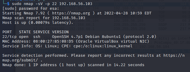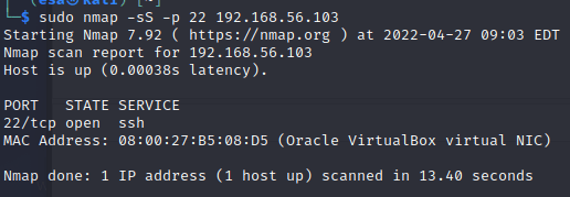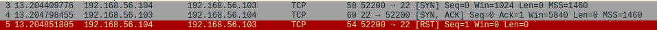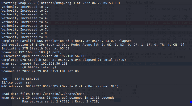 The output and traffic generated by command “sudo nmap -sS -p 22 192.168.56.103”. The “-sS” parameter is optional as the command was run as root. The same result could have been achieved without the parameter. From the traffic can be seen that the TCP handshake was never finished. The output included information about the state of the port and the service that was running on the port.