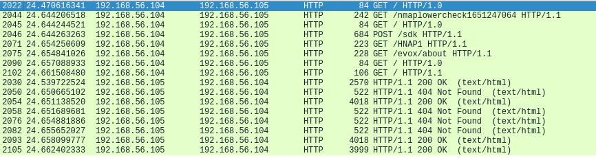 In the traffic capture below the packets are filtered with “http” and are sorted by source. As can be seen, Nmap sends seven different GET requests and one POST request to the server. Each one of the packets are different probes from the “nmap-service-probes” database and return information to the client with the server’s responds.