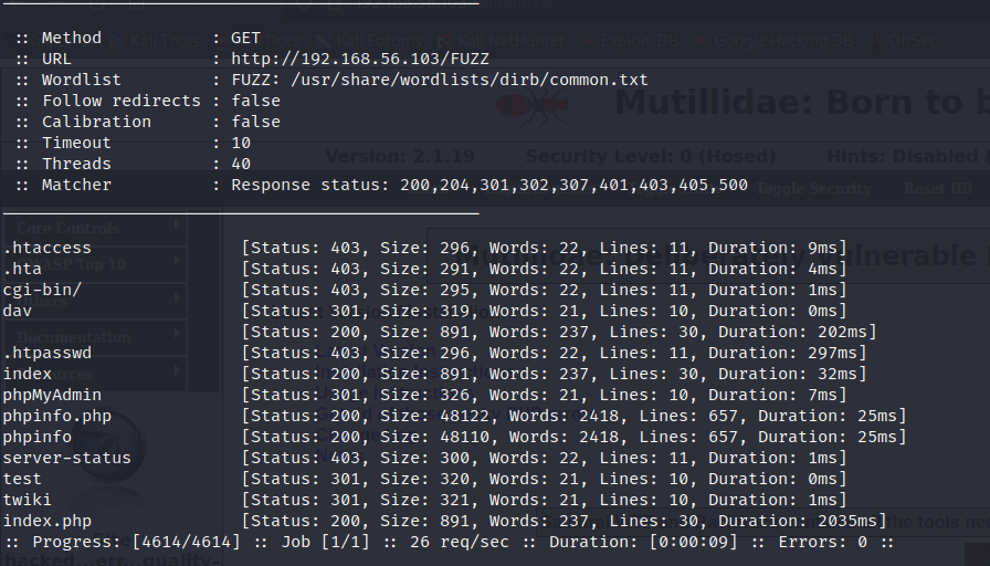 Ffuf is a tool that can be used for content discovery. The program is capable of using multiple methods, but this task focuses on the most basic one. Reading through the manual page was required to learn how to use the program. Flag -D activates the DirSearch directory wordlist compatibility mode, -u <url> sets the url and -w <wordlist> takes in the wordlist file. It is important to note that the word “FUZZ” must be always present in the command, usuallt it is integrated to the URL. Command “ffuf -u http://192.168.56.103/FUZZ -D -w /usr/share/wordlists/dirb/common.txt” generated this output. The scanned machine was the Metasploitable 2.