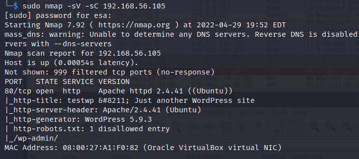 First I tested that the WordPress service can be found and accessed from my Kali machine. I was able to locate it with a scan in Nmap.