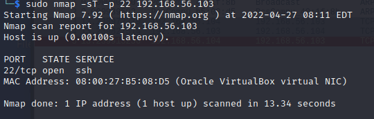 All the tests were run with command “sudo nmap -p 22 192.168.56.103” with specific options turned on during runtime.