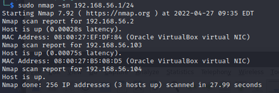 I used Kali Linux version 2022.1 with latest updates installed on 26.04.2022 at 21:00. The target machine was Metasploitable 2 version 2.0.0. Both machines were run in VirtualBox version 6.1.32. The tasks were done in an isolated network by using host-only networking feature of VirtualBox. I confirmed that the machines had no internet connectivity by only enabling the host-only network adapters and pinging Google’s and CloudFlare’s DNS addresses. The machines were unable to connect to the internet, but could find each other in the 192.168.56.x address space. I used Wireshark version 3.6.3 to capture the traffic. I got the Metasploitable 2 machine IP address by scanning the 192.168.x.x. address space with /16 mask.