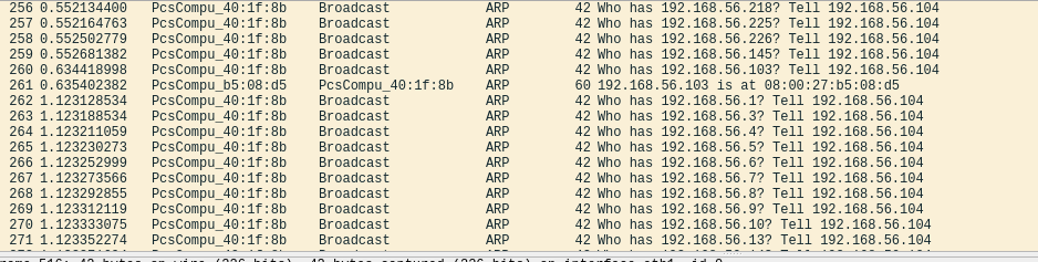 The traffic generated by the scan in a local network included ARP queries to all the possible hosts, nothing else. The output of the scan was a list of hosts that responded to the query in the network. In the example below, I used a /24 mask to scan the whole address space assigned for the host-only networking. The found hosts were my DHCP server, the Kali machine I was using and the Metasploitable 2 machine.