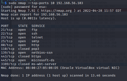 I used command “sudo nmap -sV 192.168.56.103” and “sudo nmap -A 192.168.56.103” for the tests. The reason I chose to scan the whole host instead of just singular port is that it gives better data to compare the amount of traffic generated and the time the scan took. The tests were ran with sudo rights because I feel it is fairly unrealistic to perform this kind of scan without administrator rights.