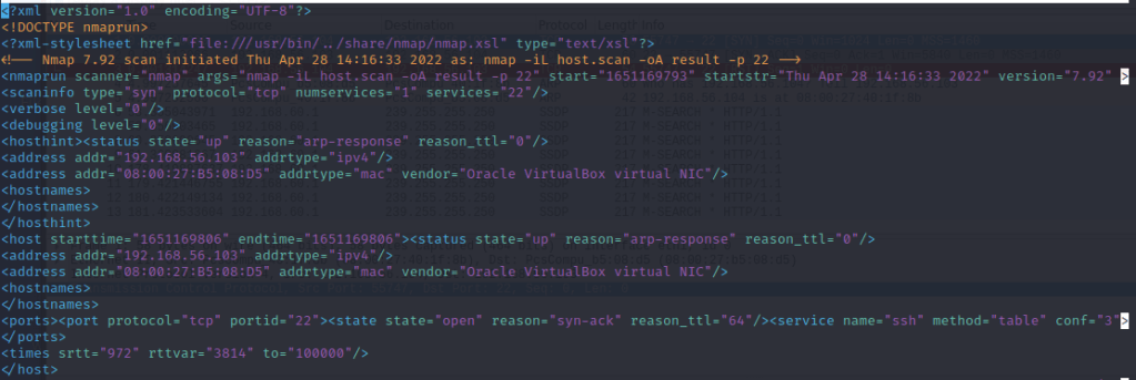 I ran the same command as in previous task, this time with added “-oA result” parameter. The terminal output and the traffic were the same as in previous task. I opened each of the files with nano to see how they look.
