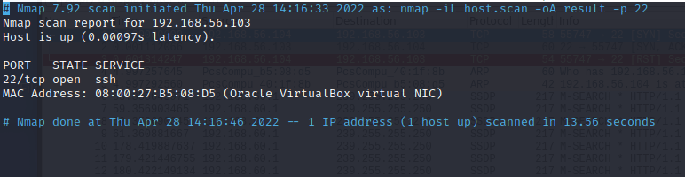 I was familiar with the netmask, comma-limited value and entering multiple hosts already, so I tried the file method. First I created a file “host.scan” which only content was the IP address of the Metasploitable 2 virtual machine. Then I ran command “sudo nmap -iL host.scan -p 22” to scan port 22 of the machine. The scan ran successfully, the output and the generated traffic were same as with the default scan.