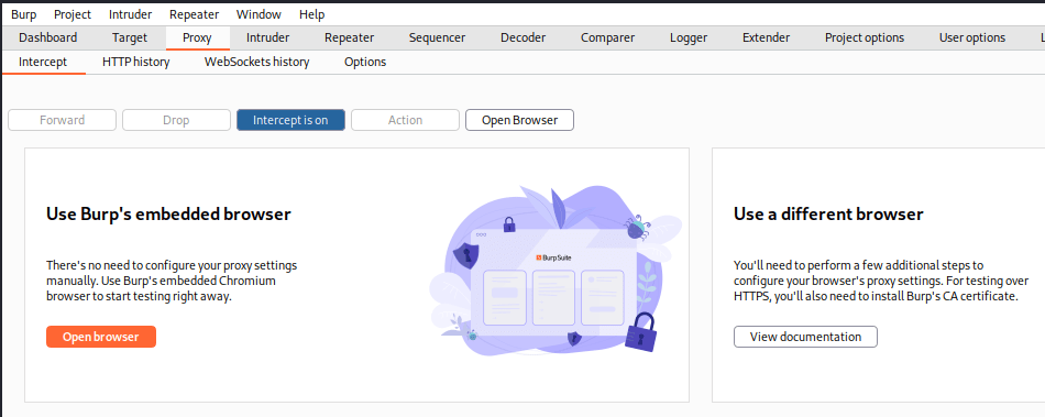 The Burpsuite interface is easy to navigate. A tab called proxy leads to the proxy tool. I opened the “Intercept” tab and clicked on the “Open browser” button. I made sure that intercept was on. A Chromium based browser opened with the proxy configuration already set. The proxy works also with other browsers, but then the proxy has to be manually set. The proxy settings can be seen under “Proxy” tab and selecting a sub-tab “options”.