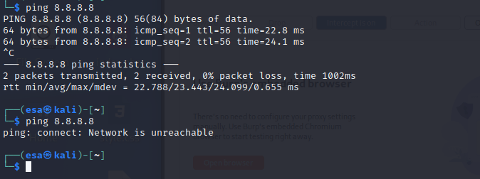 Next I disabled any internet adapters on the system to minimize the chances of accidentally scanning wrong targets or leaking packets to wrong sites. Pinging Google DNS server confirmed the internet connection was gone.