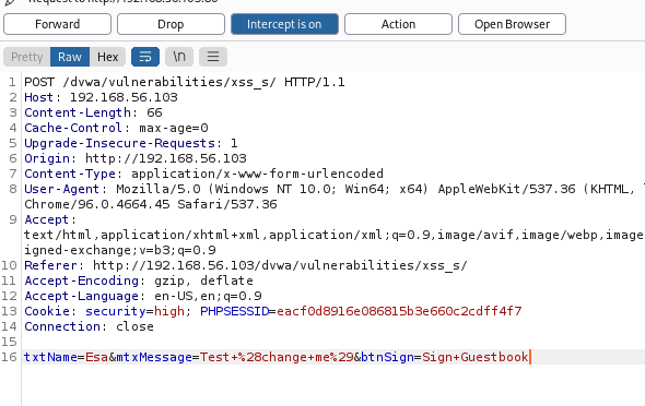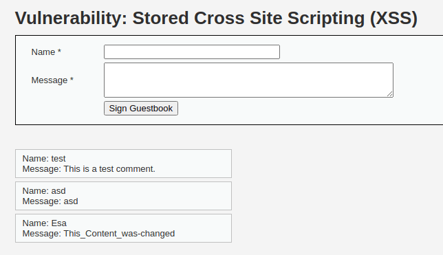 I used the “XSS stored” page to demonstrate the changed request. The original comment I wanted to insert was as is displayed below: