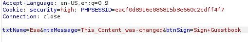I clicked “Sign Guestbook” and intercepted the request in Burpsuite. The intercepted request looked like this: