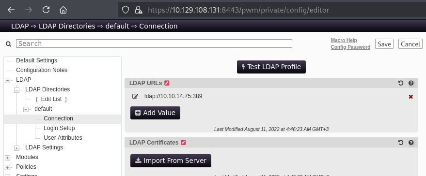 Sadly, the password is not stored in cleartext in the configuration files. However, as LDAP passwords are sent in cleartext when using simple blinds, we can easily steal the password. First the configuration of the app has to be changed. We want the service to be reaching out to the attack box (by modifying the LDAP URLs value):