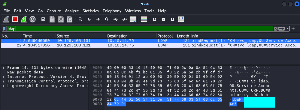 We can also retrieve the credentials by capturing traffic with Wireshark. Filtering with “ldap” is the simplest way find the correct packet: