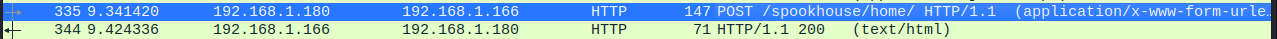 The interesting stuff begins to happen in packet 335. There is a out-of-the-ordinary POST request made to the server. The request is sent to “/spookyhouse/home/” URL. The data of the request is quite odd: