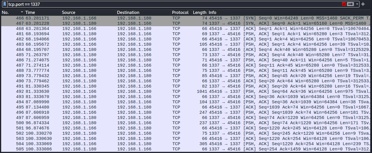 Obviously the HTTP traffic is not sufficient anymore to follow the adversary’s actions since the connection is now via Socat, and the Wireshark filter must be changed. Since it is known the adversary is using port 1337 in his system, it is possible to filter the socat session traffic by using filter “tcp.port == 1337”.