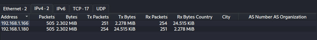 The challenge files include only one pcap file. The capture is not terribly long, 505 packets. Analyzing the file in Wireshark, seems like there are only two endpoints communicating. The address ending in 166 seems to belong to the server, and the other one, ending in 180, for the adversaries.